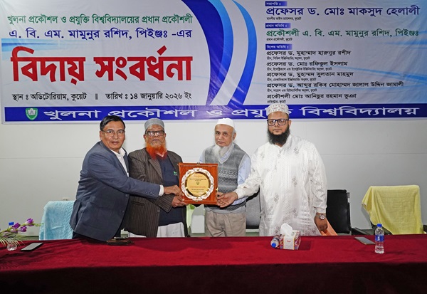 খুলনা প্রকৌশল ও প্রযুক্তি বিশ্ববিদ্যালয়ের (কুয়েট) প্রধান প্রকৌশলী এ. বি. এম. মামুনুর রশিদ, পিইঞ্জ-এর চাকুরী হতে অবসর গমন উপলক্ষ্যে বিদায় সংবর্ধনা অনুষ্ঠিত হয়েছে। বুধবার (১৪ জানুয়ারি) বিকালে বিশ্ববিদ্যালয়ের অডিটোরিয়ামে ভাইস-চ্যান্সেলর প্রফেসর ড. মোঃ মাকসুদ হেলালী-এর সভাপতিত্বে অনুষ্ঠানে প্রধান অতিথি হিসেবে উপস্থিত ছিলেন বিদায়ী প্রধান প্রকৌশলী এ. বি. এম. মামুনুর রশিদ।
