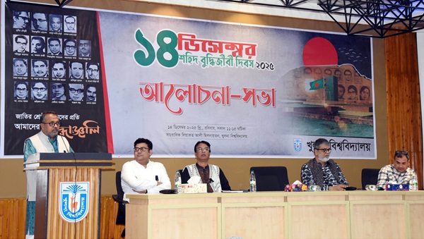 খুলনা বিশ্ববিদ্যালয়ে রবিবার (১৪ ডিসেম্বর) যথাযোগ্য মর্যাদা ও ভাবগাম্ভীর্যের মধ্য দিয়ে শহিদ বুদ্ধিজীবী দিবস পালিত হয়েছে। দিবসের শুরুতে সকাল ৮টায় প্রশাসনিক ভবনের সামনে কালো ব্যাজ ধারণ, জাতীয় পতাকা অর্ধনমিতকরণ এবং কালো পতাকা উত্তোলন করা হয়। এরপর প্রশাসনিক ভবনের সামনে থেকে একটি শোভাযাত্রা বের হয়ে শহিদ মিনারে গিয়ে শেষ হয়। সেখানে বিশ্ববিদ্যালয়ের পক্ষে শ্রদ্ধাঞ্জলি নিবেদন করেন উপাচার্য প্রফেসর ড. মোঃ রেজাউল করিম।