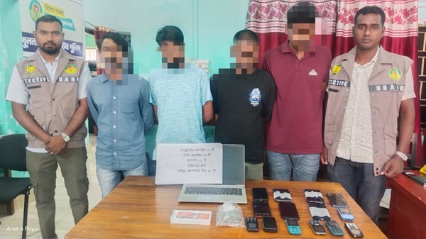 নগরের সোনাডাঙ্গা এলাকায় অভিযান চালিয়ে অনলাইন জুয়া চক্রের ৪ সদস্যকে গ্রেফতার করেছে খুলনা মহানগর গোয়েন্দা পুলিশ (কেএমপি ডিবি)। এ সময় তাদের কাছ থেকে ১৪টি মোবাইল ফোন, একটি ল্যাপটপ ও ৮৫ গ্রাম গাঁজা উদ্ধার করা হয়।