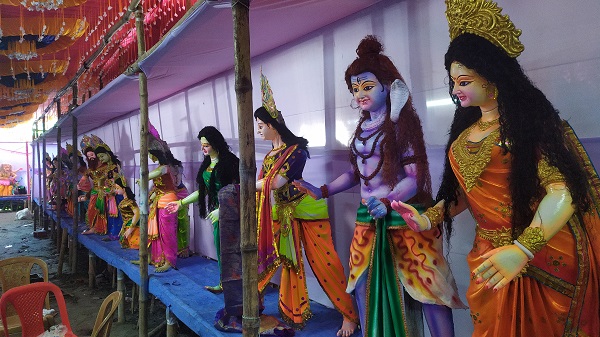 দুটি মন্ডপের ভাস্কর (প্রতিমার কারিগর) কিশোর বিশ্বাস ও সৌরভ সরকার জানান, তারা গত তিন মাস ধরে নিরলস ভাবে মুর্তি তৈরি করে যাচ্ছেন। রাত পোহালেই ষষ্ঠী। তাই তাদের প্রতিমা গড়ার কাজ শেষ পর্যায়ে।