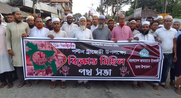 সাতক্ষীরার তালায় উপজেলা জামায়াতে ইসলামীর উদ্যোগে পল্টন ট্রাজেডি স্মরণে বিক্ষোভ মিছিল ও পথসভা অনুষ্ঠিত হয়েছে। মঙ্গলবার (২৮ অক্টোবর) বিকেলে তালা বিদে হাইস্কুল মাঠে আয়োজিত এ অনুষ্ঠানে সভাপতিত্ব করেন উপজেলা জামায়াতের আমির মাওলানা মফিদুল্লাহ এবং সঞ্চালনা করেন উপজেলা সেক্রেটারি ইদ্রিস আলী।