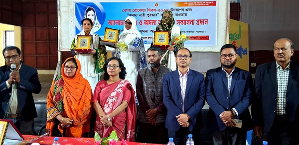 আলোচনা শেষে বিভিন্ন কাজের অবদানের জন্য যারা অদম্য নারীর সম্মাননার পুরস্কার পেলেন তারা হলেন, বীথি রানী সরকার, শারমিন সুলতানা, জাহানুর সিদ্দিক, ছবি রানী সাহা ও নিপা বেগম। এসময় অদম্য নারীদের উত্তরীয় পরিয়ে ফুলেল শুভেচ্ছাসহ ক্রেষ্ট, সদন প্রদান করা হয়।