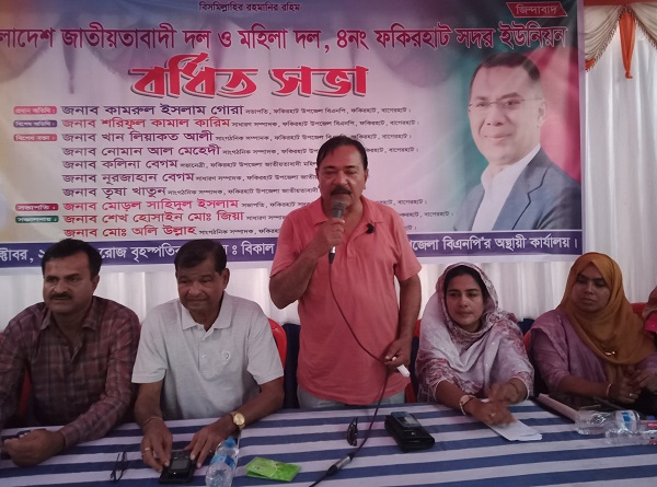 ফকিরহাট সদর ইউনিয়ন বিএনপির সভাপতি মোড়ল সাহিদুল ইসলাম এর সভাপতিত্বে এবং সদর ইউনিয়ন বিএনপির সাধারণ সম্পাদক শেখ হোসাইন মো: জিয়া ও সাংগঠনিক সম্পাদক মো: অলিউল্লাহ’র সঞ্চালনায় সভায় প্রধান অতিথি হিসেবে উপস্থিত ছিলেন ফকিরহাট উপজেলা বিএনপির সভাপতি শেখ কামরুল ইসলাম গোরা। প্রধান বক্তার বক্তব্য রাখেন ফকিরহাট উপজেলা বিএনপির সাধারণ সম্পাদক শেখ শরিফুল কামাল কারিম। বিশেষ অতিথি হিসেবে উপস্থিত ছিলেন ফকিরহাট উপজেলা বিএনপির সাংগঠনিক সম্পাদক খান লিয়াকত হোসেন, নোমান আল মেহেদী, উপজেলা জাতীয়তাবাদী মহিলা দল সভানেত্রী কলিনা বেগম, সাধারণ সম্পাদক নুরজাহান বেগম,সাংগঠনিক সম্পাদক তৃষা খাতুন।