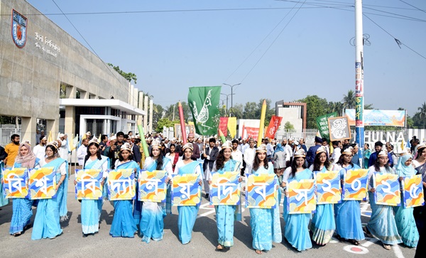 দিবসটি উপলক্ষ্যে সকাল ১০টায় বিশ্ববিদ্যালয়ের মেইন গেট ‘শহিদ মীর মুগ্ধ তোরণ’ থেকে বর্ণাঢ্য শোভাযাত্রা বের করা হয়। শোভাযাত্রাটি দ্বিতীয় গেট ঘুরে অদম্য বাংলা চত্বরে গিয়ে শেষ হয়। শোভাযাত্রায় খুলনা বিশ্ববিদ্যালয়ের প্রথম উপাচার্য প্রফেসর ড. মোঃ গোলাম রহমান এর নেতৃত্বে বর্তমান উপাচার্য প্রফেসর ড. মোঃ রেজাউল করিম, উপ-উপাচার্য প্রফেসর ড. মোঃ হারুনর রশীদ খান, ট্রেজারার প্রফেসর ড. মোঃ নূরুন্নবী এবং বিভিন্ন স্কুলের ডিন, রেজিস্ট্রার (ভারপ্রাপ্ত), ডিসিপ্লিন প্রধান, ছাত্র বিষয়ক পরিচালক, প্রভোস্ট, বিভাগীয় পরিচালকসহ শিক্ষক-শিক্ষার্থী ও কর্মকর্তা-কর্মচারীবৃন্দ অংশগ্রহণ করেন।