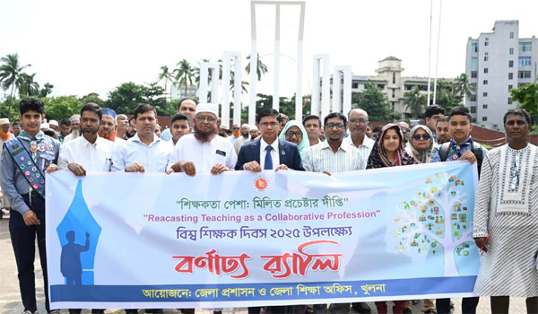 শিক্ষকতা পেশা: মিলিত প্রচেষ্টার দীপ্তি Recasting Teaching as a Collaborative Profession এই প্রতিপাদ্যকে সামনে রেখে বিশ্ব শিক্ষক দিবস উপলক্ষ্যে আজ রোববার (০৫ অক্টোবর) খুলনা শহীদ হাদিস পার্ক থেকে এক বর্ণাঢ্য র্যালি অনুষ্ঠিত হয়। র্যালিটি নগরীর বিভিন্ন রাস্তা প্রদক্ষিণ করে খুলনা জেলা প্রশাসনের কার্যালয়ে এসে শেষ হয়।