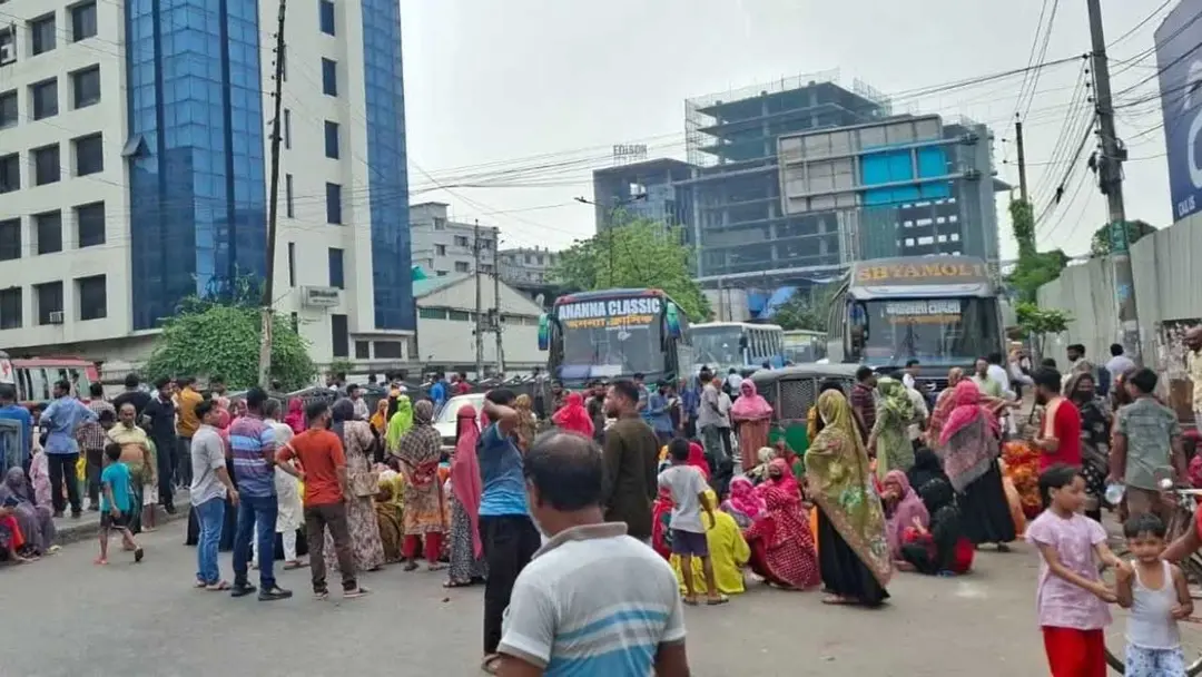 রাজধানীর মহাখালী-নাবিস্কো এলাকার মাঝামাঝি তেজগাঁও লিংক রোডের মুখে বকেয়া বেতনের দাবিতে সড়ক অবরোধ করে আন্দোলন করছেন একটি পোশাক কারখানার শ্রমিকরা।
